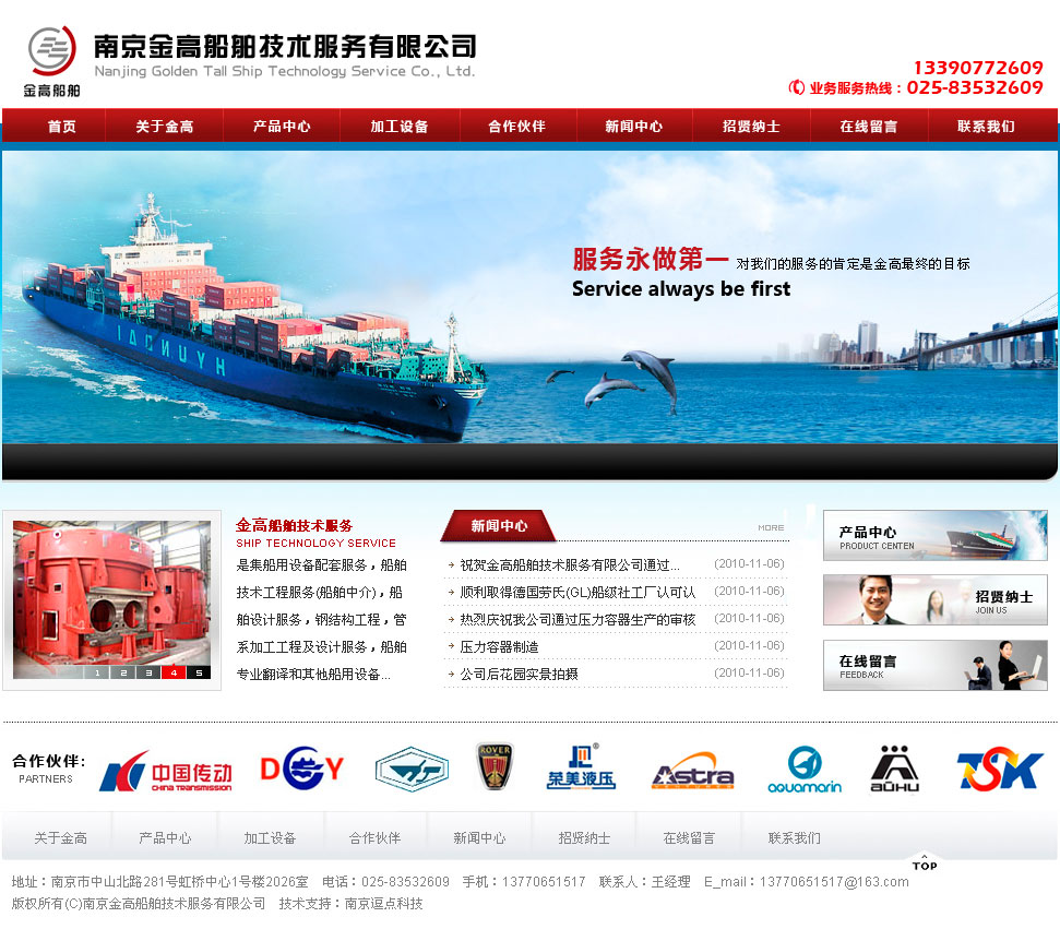 南京金高船舶技術(shù)服務(wù)有限公司是集船用設(shè)備配套服務(wù),船舶技術(shù)工程服務(wù)(船舶中介),船舶設(shè)計服務(wù),鋼結(jié)構(gòu)工程,管系加工工程及設(shè)計服務(wù),船舶專業(yè)翻譯和其他船用設(shè)備的服務(wù)公司。本公司與國內(nèi)多家大型船廠和大型鋼結(jié)構(gòu)企業(yè)有著良好的合作關(guān)系,其中包括南京武家嘴船廠,江蘇鼎衡船業(yè),江蘇科進船業(yè),南京高精船用設(shè)備公司,鎮(zhèn)江同舟螺旋槳公司,滁州(南京)大益船舶,南通沿江管業(yè)公司。本公司還與國內(nèi)多家船舶設(shè)計院有著良好的關(guān)系,設(shè)計院包括上海船舶研究設(shè)計院、上海佳豪船舶設(shè)計院、中國船舶工業(yè)第七零八研究所、上海恒波設(shè)計公司、南京歐海船舶科技公司等。本公司管理層致力于中國船舶業(yè)的發(fā)展,把船舶配套服務(wù)作為公司發(fā)展的主線。使本公司代理的南高齒的船用推進系統(tǒng)能廣泛的運用到全世界的船舶上。本公司的宗旨是:優(yōu)質(zhì)服務(wù),誠信做人,互惠互利,共同發(fā)展。目的是促進國產(chǎn)船用設(shè)備的發(fā)展和提高國產(chǎn)船用設(shè)備的市場占有率。